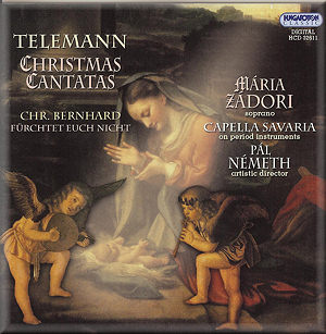 The last item on this disc is a sacred concerto by Christoph Bernhard. He is first and foremost known as a pupil of the most famous German composer of the 17th century, Heinrich Schütz. He wrote some treatises, which found a wide circulation throughout Germany, and these are generally considered reflective of the views of his teacher. He started his career as an alto singer in Dresden, worked for some time in Copenhagen and later in Hamburg, and in 1681 he was appointed Kapellmeister in Dresden. The piece recorded here is very different in structure from Telemann's cantatas. It is a specimen of the 17th-century German sacred concerto: it begins with an instrumental sonata which is repeated as a ritornello between the vocal sections, scored for soprano. The texts are all from the Bible: "Behold, I bring you glad tidings of great joy", "For unto you is born this day" and "Glory to God in the highest".