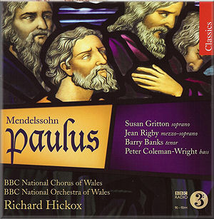 In contrast the present version is very much “Paulus” as we normally hear it on the rare occasions that it appears in the concert hall. The chorus and orchestra are as good as anyone might reasonably expect in putting forward such an approach, and it is not their fault if the result does sound a little faded in part, even, dare one say it, a little dull. The soloists are generally satisfactory. Jean Rigby and Peter Coleman-Wright are indeed much more than that. Susan Gritton’s tone seems at times somewhat harsh and Barry Banks as recorded here has an obtrusive vibrato and produces an occasional unattractive sound at the end of words. As these are not comments that I would have made about either singer heard live, I can only assume that it must be a result of the recording or the recording venue. Incidentally although this is described in the booklet as a live recording there are no extraneous noises or signs of audience reaction whatever.