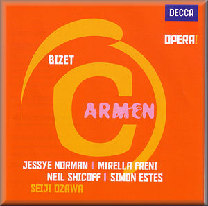 Jessye Norman (soprano) – Carmen; Mirella Freni (soprano) – Micaëla; Neil Shicoff (tenor) – Don José; Simon Estes (bass-baritone) – Escamillo; Jean-Philippe Courtis (bass) – Zuniga; Ghylaine Raphanel (soprano) – Frasquita; Jean Rigby (mezzo) – Mercédès; Francois Le Roux (baritone) – Le Dancaire; Gérard Garino (tenor) – Le Remendado; Nicolas Rivenq (baritone) – Moralès; Pierre Sébastian (spoken role) – Lillas Pastia; Serge Coorsan (spoken role) – Un Guide; Choeurs de Radio France, Maîtrise de Radio France, Orchestre National de France/Seiji Ozawa