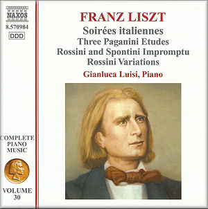 The present disc contains some his best known arrangements - half of the Studies after Paganini, as well as some of his least known - the set of Soirées Italiennes based on songs by the Italian composer Saverio Mercadante (1795-1870), his somewhat older contemporary. Why they are so little known would be a mystery were Liszt’s output less voluminous. Admittedly the original material is perhaps not as interesting as were Rossini’s songs that formed the basis for Liszt’s slightly earlier Soirées Musicales, but they do have some individuality which Liszt’s wonderful elaborations bring out to the full. There are six pieces in all in the set, including a Canzonetta, a Galop, a Serenade and a Bolero. Taken as a whole they are engaging and well worth getting to know. I have not heard the version by Leslie Howard in his Hyperion series but these versions by the Italian pianist Gianluca Luisi meet admirably all Liszt’s varied technical and musical demands.