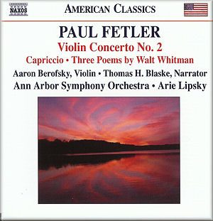 The disc concludes with another substantial and immediately appealing work – the Violin Concerto No.2. Sinuous lyricism is again a phrase that springs to mind. Fetler has the ability to write melodic lines that although they are widely spaced and range across the instrument’s entire spectrum cohere. I am always loath to say any new composer or work “sounds like” – that is usually down to my lack of deeper knowledge of the new work in question – but I heard strong echoes of the Syzmanowski Violin Concerto No.1. Not that Fetler is in any way copying the other work – simply they seem to share a similar aesthetic with aural images of birdsong and night common to both. I like the way he creates an atmosphere at once both tranquil yet tinged with foreboding. Berofsky plays with all assurance he showed in the Whitman settings. Praise here to the engineers who have him ideally placed within the orchestral sound picture. Berofsky matches his tone ideally to the rhapsodic mood of the work – this is not a work which would benefit from a muscular powerhouse approach. Although the work is cast in the traditional fast/slow/fast format Fetler has created a highly original work. The orchestration tends to be more sparing than in the Whitman, certainly in the opening two movements, but that is very much in keeping with the night-music mood. The central Adagio opens with a lyrically simple song without words over sustained chords and arpeggiated pizzicato figures. There are beautiful dialogues for the violin and oboe and then horn before the violin continues on its wistfully nostalgic way returning to the opening song. The tutti violins join and a very gentle climax is reached. The movement draws to its dream-filled conclusion with further rhapsodising from the solo violin and a final recalling of the opening material – this is a beautifully proportioned and deceptively innocent movement. Again, Fetler enjoys the theatricality of a jolting opening to the concerto’s finale – a fuller orchestra than we have heard elsewhere in the work. There is a Waltonian bustle and energy with orchestra and soloist chasing each other around a musical playground. A quasi-fugal passage allows the soloist some brief respite and when the violinist does re-enter it is with another lyrical passage although the orchestra seems intent on continuing its game of tag beneath him. As in the rest of the concerto the solo writing sounds eminently well conceived and practical. After one last reflective cadenza the scampering energy of the opening resumes (Fetler does like his temple-blocks, they add a distinctive timbre to his orchestral palette) and all involved dash to the finishing post. This is one of those lucky pieces that is immediately appealing on first listening but continues to impress the more one gets under the skin of the work. Conductor Arie Lipsky clearly has full measure of these works and Fetler is fortunate to have him and his orchestra as such enthusiastic advocates of his work. The engineering of this disc is not by any of the usual Naxos teams but as mentioned above, with the single exception of the spoken voice, it sounds exceptionally well.