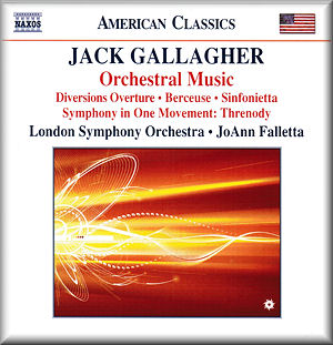 This is the first time I have encountered the music of Jack Gallagher but given only one of the four works is receiving its recording debut clearly there are other discs of his work out there to be heard. All of the music is well crafted but what eludes me is a sense of the individual voice, a musical personality that commands my attention. The disc opens with the Diversions Overture. The calm opening has a gently pastoral feel to it with the open woodwind chords adding a hint of Coplandesque prairie that typifies much American music – lovely oboe playing here. For an overture perhaps it takes a bit too long to get fully into its stride – over four minutes into a ten minute work seems disproportionate to me. The central section certainly rollocks along although the spirit here is somewhat filmic and swash-buckling; John Williams out of Alfred Newman. This is comfortably tonal music – nothing wrong in that at all – it is just for me it revisits musical ground others have already covered at some length. The return to the opening calm feels rather abrupt and not wholly convincing. The Berceuse that follows is an orchestration of a 1976 piano work. This occupies the same gently graceful world as Walton’s Siesta although again the harmony is more obviously lush. It makes for a pleasant five minutes or so but sadly to my ear remains stubbornly un-memorable. The five movement Sinfonietta is for strings alone. What is it about films and this composer but now in the opening Intrada I hear echoes of Bernard Herrmann and Psycho (the famous opening sequence when Janet Leigh is driving her car at night) in the nervously energetic figurations and lyrical counter melodies in the cellos/bass. The Intermezzo that follows I find more interesting; the basic lilting calm disrupted by arabesque figurations that snake their way through the otherwise transparent texture. The third movement Malambo is quite a rhythmic tour de force for the orchestra – it is also the longest movement in the work. Gallagher in his own liner note, mentions Ginastera as writing stylised forms of this dance – most famously as the conclusion to the ballet Estancia. Gallagher’s version does not achieve the earthy primal vigour of Ginastera either in Estancia or elsewhere probably because he chooses not to maintain an underlying rhythmic cell which adds to the cumulative impact of that kind of ritualised competitive dance immensely. Instead it seems to take some of the elements of a malambo and give them a concert hall treatment which is fine but not that interesting. Likewise the fourth movement Pavane is perfectly pleasant without sticking in the memory. The final Rondo Concertante has a boisterous moto perpetuo energy and its use of a solo group of players has echoes of Tippett’s writing for strings. Throughout the LSO play very well on what one must assume were read/record sessions but I have a nagging feeling that the last ounce of inspiration is missing in the midst of all the perspiration. Quite why this is termed a Sinfonietta as opposed to a suite is unclear unless on my superficial acquaintance I’m missing some unifying material across the work as a whole.