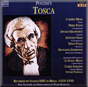No such problems with the real protagonists. Apollo Granforte (1886–1975) was one of the great Italian baritones during the inter-war years. He was the possessor of a magnificent voice, rounded and vibrant. With his mix of authority and malice he was ideally suited to the role of Scarpia. The Te Deum scene in act I is grandiose with a punchy chorus adding extra weight. The second act, which is in effect a drawn-out mental combat between two strong personalities, must alongside Callas-Gobbi and Price-Taddei rank among the foremost recorded versions ever. Carmen Melis may not be a household name today but hers was a voice of superb quality and with dramatic ability to match. She is a grand Tosca in the Tebaldi mould with ravishing beauty of tone and a thrillingly irresistible expansiveness at climaxes. Poor Piero Pauli, her Cavaradossi, only reaches this Tosca to the waist and is totally out-sung in the big duet in act I. In act II she has a worthy partner in Granforte. In the midst of this high-octane fight she delivers a magical and silvery toned Vissi d’arte. It is such a pity that there wasn’t a better tenor available. With a singer of the calibre of Pertile this could have been a definitive recording of Tosca.