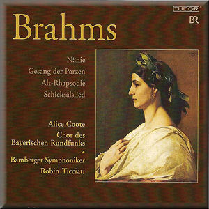 Rhapsody. Ticciati conducts it with maturity and is successful at laying out the stark winter landscape portrayed in the opening pages. Alice Coote sings very well; her vocal production is unforced and her warm, expressive tone gives much pleasure. Throughout the piece her voice is in good focus and I especially admired her poise at the telling phrase “Die Öde verschlingt ihn”. Ticciati accompanies his soloist considerately and his orchestra realises the textures of the music very well. Miss Coote is successful in putting across the introspective side of the piece and then, when the famous heart-easing melody appears - “Ist auf deinem Psalter” – her delivery of it is lovely, with the male voices of the choir in good support.