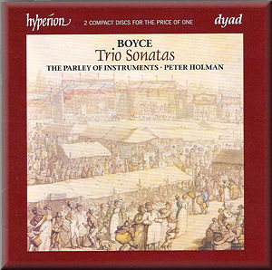 The Parley of Instruments and Peter Holman preferred, back in October 1995, to alternate quartet and orchestral performances of the Trio sonatas. There is some evidence that not only were the Trio sonatas performed orchestrally but that some at least were devised for larger forces. Note too that Hyperion includes the three sonatas, numbered 13-15, that survive in manuscript, though not in Boyce’s hand, at the Fitzwilliam Museum in Cambridge and were copied by Boyce’s pupil Samuel Wesley. They were not included in the 1747 publication of the Sonatas. Standage doesn’t include them, sticking to the canonic twelve.