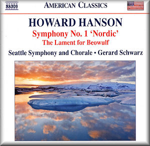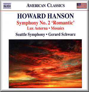 Naxos have stood shoulder to shoulder with Hanson’s music. They have recorded his piano music, a miscellany of his non-symphonic orchestral music two sets of the opera Merry Mount (Serafin; Schwarz) and even started an earlier Nashville cycle of the symphonies with one disc. The latter fell by the wayside when conductor Kenneth Schermerhorn died. Now Naxos picks up the guttering torch through licensing recordings issued originally by Delos. They have done the same thing with Diamond, Schumann and Piston. It is clear that these discs are not going to be crammed to the CD limit. Even so this series will breathe new life into the cycle and at bargain price. Nor is this an also-ran. Schwarz finds the vital spark to ignite these works to make them glow and flame. The Symphony No. 1 is effulgently passionate and lives up to its name though without quite as many Sibelian touches as its reputation would suggest. Still, this is out-and-out romantic music and instantly enjoyable. Hanson’s own Eastman/Mercury recordings are vied with though their super-virile close-up grainy analogue impact compares ever so slightly unfavourably as against these refined yet full-blooded fresh recordings. That said they are now verging on a quarter century old. The second movement of No. 1 is the epitome of tenderness in Schwarz’s hands as is the second in the Romantic complete with its pre-echoes of the Born Free theme. The Second Symphony under Schwarz also has the prescribed electricity and lusty euphoria though he still falls just short of the ecstatic abandon conveyed by Charles Gerhardt in his 1967 Chesky recording with the National Philharmonic. The high fast trilling strings of the finale and the rampant horns are gloriously confident. The Second was recycled into the Seventh Symphony in much the same way that Elgar re-ran material from earlier works in his The Music Makers. Schwarz delivers an estimably atmospheric, stern and driven Lament for Beowulf where the voice he might have been attending was that of Holst – listen to the parallels with The Hymn of Jesus (1917). The words are legibly reproduced in the admirable booklet. Lux Aeterna, a tone poem for viola and orchestra dates form the year after the Nordic. Its plangently sounded and undulating smooth contours and peppery dialogue with the viola and solo woodwind show the influence of his teacher Respighi. The grand orchestral scores of Respighi afflatus is very much in evidence and a real pleasure it is too. The Hanson of the later 1920s is also more than hinted at. Mosaics is a much later score written for Szell and Cleveland. It’s attractive and varied but lacks the intensity of the works of the 1920s and 1930s.