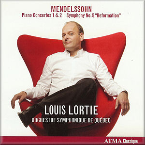 Lortie takes over the baton exclusively for the Reformation Symphony. He has a good feel for the score - his reading would go over well in concert - and occasionally evinces an ear for detail: the bass note connecting the third and fourth movements is clearly present, for example, avoiding the usual brief lapse in continuity. Lortie's flowing, cantabile phrasing evokes the right meditative spirit, while his forthright, no-nonsense rhythmic address avoids the whiff of sanctimony that can hover about the score, particularly in the finale with its quotations of the Lutheran chorale Ein' feste Burg. At first, the main section of that movement, beginning at 1:14, sounds hasty, but it settles nicely by the time the chorale resumes at 3:58. Elsewhere, passing ensemble flaws - a nervousness about the tremolo phrases in the first movement, some miscoordination in the pulsing bits of the scherzo - are a distraction.