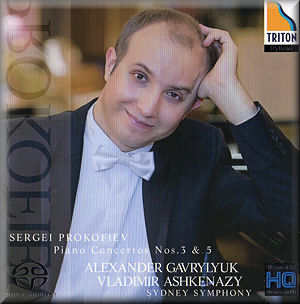 Alexander Gavrylyuk is one of the younger generation of pianists all of whom have technique galore and therefore no difficulties with the notes of these two great Prokofiev pieces. With the experienced Vladimir Ashkenazy moving from keyboard to conductor's podium on this occasion, Gavrylyuk has everything going for him. What he brings is musicianship and a hard to define panache. He has been compared to a young Horowitz and one can see why. Having heard Gavrylyuk live recently I can vouch for his star quality so maybe the recording environment was less favourable on this occasion. However, that panache was not obvious in the first movement of No.3 which seemed a bit careful compared to Martha Argerich on a 1967 DG recording and Béroff on EMI from 1974, the recordings I had to hand. I did miss the delicate tappings from the castanets that do much to spice up the movement. Exton have not given the percussion enough prominence and there is little depth to the sound-picture. There are opportunities for virtuoso interplay between soloist and orchestra that were not taken. The Sydney orchestra strings and wind sound a little uneasy with the complexities of the score and I began to worry that this might be another inadequate Prokofiev disc from Exton (see the review of the Kijé). Not so. Things looked up in the theme and variations second movement and by the finale all was well with detailed and lively playing and a very enjoyable rendering of those big tunes where Prokofiev seems to tip his hat to Rachmaninov.