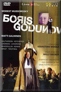 Boris Godunov, Tsar of Russia - Matti Salminen (bass); Fyodor, his son - Brian Asawa (counter-tenor); Xenia, his daughter - Marie Arnet (soprano); Xenia's Nurse - Stefania Toczyska (mezzo); Prince Vassily Ivanovich Shuisky, a Boyar - Philip Langridge (tenor); Andrei Schelkalov, secretary of the Boyars - Albert Shagidullin (bass); Pimen, a monk - Eric Halfvarson (bass); Grigory, the false Dimitri, - Pär Lindskog (tenor); Varlaam, a roistering friar - Anatoly Kocherga (bass); Missail, his companion - José Manuel Zapata (tenor); A Simpleton - Alex Grigoriev (tenor)