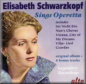 The first thirteen tracks on this disc were issued in the 1950s as an LP. It immediately became a classic – and has so remained. The sound was very good for its time and this transfer sounds magnificently well. The programme is delectable, every song is a gem and – most important of all – Elisabeth Schwarzkopf has never been surpassed as an operetta singer. She was a great opera singer too: Mozart, Richard Strauss but also ventured into the Italian repertoire and sang Mrs Ford and Liů on complete recordings. All through her career she also championed the song repertoire: Mozart, Schubert and Hugo Wolf being particular favourites. Being an immensely sophisticated singer one might think she was too refined for down-to-earth operetta. But it is the other way round. Many of the great operetta roles are refined women. If in provincial performances they can seem pretty plain, when ennobled by a singer who can find the many subtle nuances, then the characters become real persons. Elisabeth Schwarzkopf was that kind of singer. She had a glorious voice when she was in her prime, as here, but that’s only half the secret. It’s the way she turns the phrases, caresses the melodies, gives ‘face’ to the characters. Elegance, charm and a twinkle in the eye – that’s the essence of Schwarzkopf.