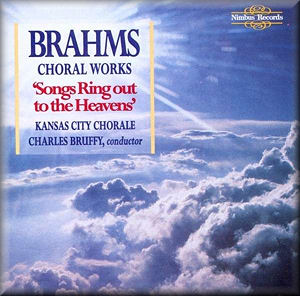 One of the more foolish items in the British music press of the last year was a league table presuming to list in order of merit the world’s twenty finest choirs. Aside from any minor concerns about relevant criteria - only choirs whose performance material centred on what could be termed western ‘classical’ seem to have been judged - the utter impossibility of making absolute judgements about the merits of wildly diverse groups seems to have not concerned the compilers of such a list a jot. Good I guess for your group’s publicity machine if you made the list but wildly infuriating for the many who do not seem to have even been considered. More to do with weight of catalogue presence and therefore familiarity I wager than pure ability. Don’t get me wrong, the final twenty comprised superb choirs but the absence of any from Eastern Europe, or gospel groups or rock choirs or ensembles singing what might be collectively called folk or ethnic material fatally flawed the process. At the time the fact that no American choir either was featured caused as much of a stir as anything in the realm of classical music ever does. Listening to this superb disc from the ever-impressive Kansas City Chorale and you can understand why there was this annoyance. The Chorale under their long-serving music director Charles Bruffy recorded a series of discs for Nimbus back in the mid-nineties and it was through those that I first encountered them. Their Christmas recital Nativitas remains one of my all-time favourite discs for those seeking something away from the traditional Carols arr. Willcocks fare. The Chorale is a professional chamber choir with six voices allocated to each of the usual S.A.T.B. Their sound is characterised by a remarkably refined and balanced tone with the voices blending across all parts as well as I have ever heard. Attack and intonation are also exemplary and they have that superb ability of bending the sound they make to suit the style and period of the music they are singing. I like also the fact that their sound is not overly ‘young’. There seems to be such a predilection for choirs making an ever more pure or blanched sound that I find it something of a relief to here an out-and-out adult group. Not for a second does that imply anything matronly or lacking in focus; far from it. No surprise then that in this disc of warmly romantic music by Brahms they projected a rounded, warm and gorgeously mellifluous sound.