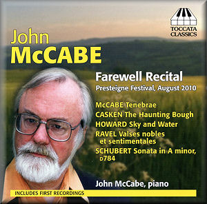 His last public piano recital was given on 29 August 2010 at the Presteigne Festival on the Welsh borders. This disc preserves that event elidng only the Haydn G minor Sonata, Hob. XV and Robert Saxton’s Chacony, both of which he has already recorded. The Schubert Sonata’s dignity-emphasised grandeur emerges sharply defined alongside its still-centred calm and dynamic fairy-flight. Emily Howard is a Liverpudlian who has had her orchestral work Magnetite commissioned by the RLPO and Vassily Petrenko. Her opera Zatopek is a London 2012 commission and will be performed in Liverpool where for years she played with the Liverpool Mozart Orchestra. Her Sky and Water was inspired by an M.C. Escher drawing in which birds morph into fishes. It tumbles with a starry, sometimes dissonant profusion of glinting and glimmering writing. It on occasion parallels that of the darker Hardy settings of Gerald Finzi and brings them close to the orbit of the piano writing of Urmis Sisask. It end in an enigmatically twinkling glow. It is very impressive in the hands of the dedicatee, John McCabe. The darkly and dramatically affirmative Haunting Bough is by John Casken who was born in Barnsley. His works have been recorded by NMC and the Violin Concerto played by Dmitri Sitkovetsy and Daniel Hope. His Cello Concerto was taken up by Heinrich Schiff. Ravel’s Valse Nobles and sentimentales is a McCabe favourite. The music is projected in a strongly muscled and thoughtful manner. In his usefully full liner-notes McCabe reminds us that these dances link affectionately with Schubert’s waltzes. He also mentions Chabrier’s Valses Romantiques. More than once I was also reminded of La Valse. In trs 9 and 11 Barber’s devil-may-care Souvenirs manner is touched upon. McCabe’s Tenebrae is in a single movement of approaching 20 minutes duration. It was written with a dedication to Barry Douglas but is the result of numerous influences including the deaths of Charles Groves, William Mathias and Stephen Oliver. In the context of this work McCabe mentions his longstanding fascination with Liszt’s La lugubre Gondole. It is an extended reflective piece trawling dark realms in liquid yet intense articulation. It’s an impressive and very personal piece with an oily menacing sheen and Gothic virtuosity. Here is a composer who demands your attention and over a long span. There’s a bell-haunted poetic soother to end the disc. This comes in the shape of Frank Bridge’s Heart’s ease which is in the same mood path as his Pastorale collection of the 1970s. It’s most magically done by McCabe whose readings evince long preparation and sustained reflection.