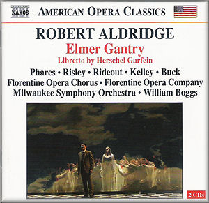 Elmer Gantry is set in the world of revival evangelism in early twentieth-century America, where the gap between the message being preached and the reality of the preachers was notably wide. All of the leading characters are in some way crooked or inadequate but all are intent on making a success of their particular brand of religion, mainly for reasons of greed. Aldridge has made very good use of the musical idioms of that time, admittedly a real gift to the composer but used here with great success both in set pieces and as a general stylistic background. The plot is involved and concerns the devious rise of the central character in various evangelical groups, and his relationships with other evangelists. It is divided into no less than fourteen scenes and has parts for numerous minor characters. There is no time for the audience to get bored as the potent mixture of religion and sex passes quickly by. I would love to see it on stage, with an imaginative producer and designer and with really theatrical singers in the main parts.