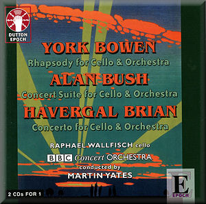 In the case of Havergal Brian there are two concertos - nothing for piano - one each for violin and this one for cello receiving its world premiere recording. Conscientious Brianites will have known the piece for years from the broadcast tape of the Thomas Igloi premiere with the Polyphonia orchestra conducted by Boult. It's typical mature Brian with stuttering note-cells, toppy woodwind and march interruptions. After a dignified yet trudgingly emotive Andante comes a haughty Allegro finale. Much of the work evinces a sturdy determination - a not unfamiliar quality in Havergal Brian scores.