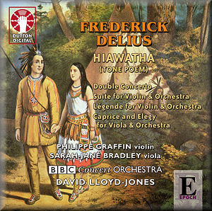 The second disc includes four pieces for soloist(s) and orchestra alongside the 1888 tone poem Hiawatha. Robert Threlfall who prepared this performing edition has wrought a wonderfully transparent skein of sound for David Lloyd-Jones and his BBC orchestra to illuminate. The music describes a steadily ascending spiral flight in Delius's most diaphanous and least congested manner. It's a lovely Tchaikovskian work. There's nothing you might recognise as specifically native American about the piece. Rather it has much in common with the style of the Florida Suite and the Sleigh Ride. This is a most attractive piece in Delius's earliest and lambently romantic style. It's a small step from the light-suffused final pages of Hiawatha into the gracious old style caramel and Kreisler romance of the four movement Suite. Early it may be - same year as Hiawatha when composer was just 26 - but one can catch echoes and pre-echoes of the Violin Concerto alongside those of the Taneyev suite, the Tchaikovsky, the Lalo Symphonie Espagnole and the Glazunov - all cognate works. The Légende, although from seven years later, might easily be a spare movement from the Suite with its Kreisler chops. Graffin is well up to the mark - lushly calorific and sweet of tone. The Double Concerto in the violin-viola edition by Tertis is a step-change by comparison. Every bar is freighted with the honey of summery nostalgia. Bradley and Graffin surrender to its rapturous communing and mutual confiding. Lastly comes the very late Caprice and Elegy which we know from the famous recording by Beatrice Harrison - such a pity there are no recordings of Harrison in the Delius Concerto or the Double. This sultry bipartite wonder of a piece is again as arranged by Lionel Tertis. The harp is lovingly lime-lighted in the slow pulse of the Caprice while the Elegy moves just as slowly and thoughtfully. The melodiously nasal tone of the viola registers most poignantly. This is a consummately communicated performance.