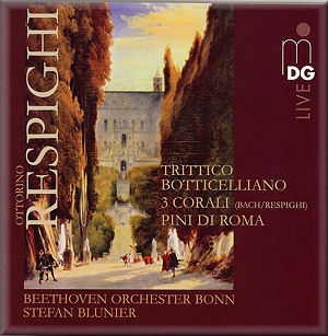 The Trittico Botticelliano consists of three movements inspired by three of the painter’s most famous paintings, all of which are in the Uffizi Gallery in Florence. Unlike Respighi’s Roman cycle or Church Windows, this work is scored for a small orchestra of strings and a few winds, plus percussion, celesta and piano. In Spring (La Primavera), the Bonn strings play extremely well, although the same cannot be said of the winds. Blunier’s conducting is especially genial, but he sometimes tends to plod rather than imparting any excitement. This criticism can also be made of his work in the other two movements, although he gets some wonderful colors from the orchestra in The Birth of Venus.
