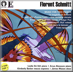 Meantime this attractive two-disc recital for two pianos emerges courtesy of long-time Schmitt champion Leslie De'ath whose Dutton series of the Scott piano music has a special niche in the catalogue. The fourteen character miniatures that make up Le petit elfe ferme l'oeil are given a spirited outing. They move with ease between skilled jaunty light salon material to pages of elusive strangeness as in the case of D'allure decidée with its awkward hiccupping dissonances reminiscent of the music of Raymond Loucheur recently encountered in the Forgotten Records catalogue (FR374). This Hopfrog oddity takes us onto the same magically and slightly Russian-nationalistic limb as Ravel's Mère l'oye and pushes the listener out towards the world of Stravinsky's Rite and Petrushka. De'ath, in his fine and full notes, refers to the linkage with Ravel's L’enfant et les sortilèges. Exotic nationalist dances such as Le parapluie chinois recall the oriental impressionism of James Friskin’s still unrecorded oriental piano suites and Holbrooke's second piano concerto L’Orient. In the same vein we then hear the five movements of La Tragédie de Salomé which muses gloomily and then erotically. It then makes links with Rimsky’s exultant Antar. The great melody is tellingly tolled out by these two artists. The possessed battering barbarity of Danse des Eclairs and Danse de l'effroi is suitably ruthless and spikily assaulting. James Mason's oboe makes an admirably atmospheric contribution in Les enchantements sur la mer and mezzo Kimberley Barber’s vocalise in Chanson de la Nourrice is lovely.