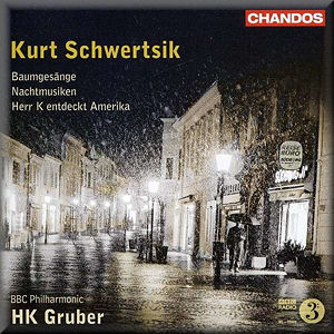 The music will be unfamiliar to you - how could it be otherwise - two of the three works receive premiere recordings and Austrian composer Kurt Schwertsik is hardly a household name. The disc opens with the most recent work - a BBC PO commission premiered in 2010; Nachtmusiken. Calum MacDonald provides a typically lucid and insightful liner-note and he describes this as a series of “memories and philosophisings under the cloak of darkness”. So this is not the night as evoked by a Bartók or a Ginastera; instead it might be termed thoughts that emerge in the still of night. This makes it both a highly personal work and one with a rather wonderful hallucinatory, disjointed feel - just how the half asleep mind jumps randomly from thought to thought. There are five movements; the first titled Janáček ist mir im Traum erschienen [Janáček appeared to me in a dream]. And that is exactly how it sounds: out of fragmentary motifs jagged repeated ostinati - most notably on the timps - that sound just like the earlier composer without being direct quotes appear and then slip from your grasp. As with dreams themselves, trying to impose a concrete meaning on this is a fruitless task. Likewise with the second movement, a slurring tipsy Viennese waltz right down to an accordion that wanders aimlessly through. This is film-music like in its deliberately saccharin sentimentality - the sophistication comes in the subtlety of the orchestration executed with typically understated skill by the BBC players. Worth mentioning at this point that the conductor is the long-time colleague and friend of H K Gruber. Gruber is a famously quirky composer in his own right so he is just the person to understand the hidden depths of this superficially laconic music. Depths are immediately revealed in the third movement … for David Drew. Drew was the Publications Director for Boosey and Hawkes who masterminded Schwertsik’s international career as well as becoming a close personal friend. He died suddenly and unexpectedly in 2009 and this movement serves as an epitaph. A quartet of cellos flecked with single glockenspiel notes sing a requiem before the orchestra plays a passage that has echoes of Bachian chorale over what sounds like a passacaglia-like bass line. This is the heart of the work and is instantly approachable yet profound. Out of the sorrow of the third movement springs a Shostakovich-like furious scherzo - Geschwindmarsch in rasender Wut [Quick march - with furious rage]. The closing Flucht starts with a strange etiolated undernourished fugue that had me in mind of a tiptoeing Nielsen. It gradually becomes more assertive though remaining essentially quiet - there is something ghostly and unnerving in these night visitors. This does build into a passage more earnestly fugal but even as it arrives it spirals off and away like a released balloon and the work ends. Aside from the central movement this is music that seems to have its eyebrow raised in quizzical humour for much of the time. The second work is elusively called Herr K entdeckt Amerika [Mr K discovers America]. This was written as part of a continuing project to create contemporary repertoire for youth orchestras. The title comes from the unfinished Kafka novel Amerika. The Herr K is the hero Karl who finds himself at the centre of a series of ever more awkward and ridiculous situations. Again Schwertsik uses multi-movement form although as MacDonald points out there is nothing here that is particularly programmatic or ‘American’. I do get a little frustrated by the use of ‘signpost’ movement titles that then seemingly have nothing to do with that title. That being the case here I’d rather put those titles to one side and enjoy the music in its own right. Herr K made less of an initial impact on me than the Nachtmusiken - there are many arresting moments and instrumental combinations but for some reason I was less able to follow the work’s logic. The final section Das Naturtheater von Oklahoma which is named after the final chapter of Kafka’s book depicting a circus builds to a syncopating climax and then rather abruptly is left hanging on a quiet chord. Clearly Schwertsik likes to create expectations that are then unfulfilled; it’s an anti-climactic approach that catches the listener out the first couple of times.