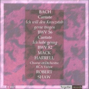 This is a favourite disc of mine, coupling Ich habe genug and Ich will den Kreuzstab gerne tragen in performances recorded in 1958. The baritone is Mack Harrell (1909-60), father of the cellist Lynn Harrell, who was to die of cancer only two years after making the recording. Robert Shaw directs the RCA Victor Orchestra and in one movement, only, of Ich will den Kreuzstab gerne tragen, its choir as well.