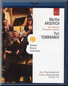 The big attraction of this Nobel concert was the presence of the great pianist Martha Argerich who turns in yet another spectacular performance of the Ravel Piano Concerto in G major. The trumpet and clarinet are a bit reticent at the start, one would have appreciated a bit more jazzy inflection, though with this very realistic concert-hall perspective it is possible one has got too used to spotlighting on soloists. This is rightly avoided here because it is the conductor's job to balance the orchestra not that of the engineers. Argerich is her usual fluent self propelling Ravel's fast tempi as if there are no limits and relaxing into his delicate lyricism like the great master (mistress) she is. The wind soloists in the slow movement are simply gorgeous to hear, especially the cor anglais. In the final presto the wind again excel, which they have to given Argerich's chosen tempo! She is obviously as pleased with the orchestra as they are with her and she and Yuri Temirkanov get the expected rapturous applause. Argerich plays a short and very beautiful encore, Chopin's Mazurka in C Op.24 No.2.