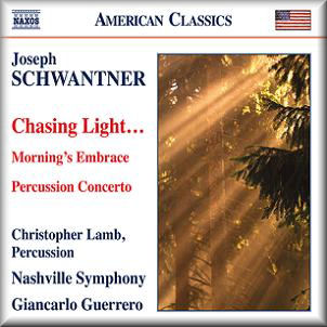 Given this endorsement, Schwantner's music is, not surprisingly, family friendly: melodic, rhythmic, varied, generally easy on the ears and brain - something of a latter-day Aaron Copland. As early as 1979 Schwantner was already winner of the prestigious Pulitzer Prize for his orchestral work Aftertones of Infinity, which has to date only been recorded once on CD (New Worlds Records, NW 381-2). His style is eclectically accessible, employing elements, though far less anaemically, much favoured by contemporary film composers, such as ostinatos, ethnic drumming, a piano in the orchestra, uplifting endings - all of which can be found in the delightful Chasing Light... and the more serious Morning's Embrace. What Schwantner's music lacks in depth - not a large deficit, by any means - it makes up for in colour, texture and excitement.