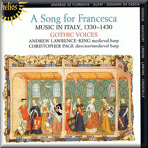 This disc was made in 1987 and has recently been re-issued on Hyperion’s budget label. The disc’s title, A Song for Francesca comes from a monophonic balata Amor mi fa cantar a la Francesca whose title could either mean ‘Love makes me sing to Francesca’ or ‘Love makes me sing in the French style’. The disc’s theme is the contrast between the Italian and French styles of the period and the way the Italians of the early 1400s were interested in music by French and Northern European composers. So the first nine items are all Italian from 14th century and the final ten items are French but from an Italian manuscript which may have originated in Venice so reflecting the kind of French music which the Italians were listening to.