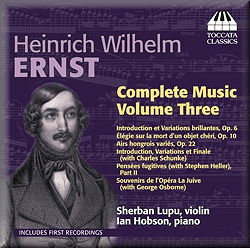 The third volume in Toccata’s Complete Ernst series is largely of premiere recordings. Only the Air hongrois variés and the Élégie sur la mort d’un objet chéri have been recorded before and even in their cases, not that often. As before, the intrepid and stylistically assured practitioners of the Moravian composer’s art are Sherban Lupu and Ian Hobson. I’ve reviewed both of the previous volumes in the series, so feel I should get straight to work in surveying the recital material.