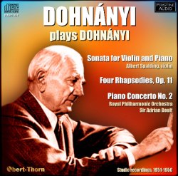 The real prize here for rarity is the recording of Dohnányi’s Violin Sonata. Recorded in 1952, it wasn’t released until 1978 when it appeared on a Varèse Sarabande LP. It joins Pristine Audio’s restoration of the Brahms sonata collaborations of Dohnányi and the elegant American violinist Albert Spalding [Pristine Audio PACM078]. In a sense it’s not a real reflection of Spalding’s stature, any more than the Brahms Sonatas which were made for Remington the previous year, given that Spalding had retired and was soon to die. Thus Spalding’s intonation wavers too often in the C sharp minor sonata, and there are several points where his technique buckles under the strain of Dohnányi’s passagework. Add to this the increasing thinness of Spalding’s tone, especially at the top, and one might be forgiven for thinking this little more than a historical curio, an artefact beloved of collectors and completists but of no real function beyond that rather rarefied, somewhat obsessive community. That would not wholly be so. The performance demarcates how Dohnányi wanted his sonata to ‘go’ and Spalding does generate a degree of romantic intensity, not least via his expressive and pervasive portamenti. There is plenty of drive in the outer sections of the finale and phrasal nobility from the violinist, though the tonal colour of his best days is long gone. So, it’s no match violinistically for Ricci, or Shumsky, or even - more relevantly in terms of its time period, perhaps - for the English violinist Thomas Matthews who recorded it on 78s for Australian Columbia. Then again, this is Dohnányi’s sonata and he is playing the piano - no small inducement.