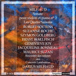 The Four Seasons is the umbrella title for a series of four concertinos written between 1934 and 1953. No one would seriously consider programming them in concert - at least I don’t think they would - not least given that they come from different periods of musical development. They’re also written for differently sized accompanying ensembles which vary in orchestration. Szymon Goldberg is the violin soloist in the Concertino de printemps and he is perfectly suited to the work’s elegant precision. Goldberg’s classical purity of tone finds a worthy vehicle in the briefest of the four concertinos. The Concertino d’été, written for viola, was composed 17 years later. The viola, played by Ernst Wallfisch, offers a darker perspective to the concertante writing, and the rather vertical wind accompanying figures and baroque punctuation points add their own personalised gloss too. There are plenty of vivid, rhythmically vital exchanges. This concertino was composed when Milhaud was at Mills College in California, as was the Concertino d’automne for two pianos and eight instruments. This was written for the duo of Gold and Fizdale but is played in this recording, under the composer’s direction, by Geneviève Joy and Jacqueline Bonneau. There’s a bit of overload in places, and the passages when the three horns are dominant add a layer of darkening breadth, but gradually a divertissement feel emerges. The last of the four is Concertino d’hiver, for trombone and strings, composed in 1953, whilst Milhaud was crossing the Atlantic by ship. He places the trombone soloist against a string orchestra. None of these concertinos is remotely conventional when it comes to Vivaldian expectations of weather painting. This one is no exception. Characterful and bumptious there’s also plenty of lyrical, indeed feelingly noble writing for the unexpected solo instrument; much colour is evoked by Maurice Suzan abetted by the knowing composer on the rostrum.