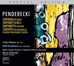 Penderecki’s Serenade has appeared on the Dux label before (see review), but this release has a far more satisfying programme even were there to be any argument about the quality of the performance. Reviews for equivalent repertoire on the Naxos label can be found here for the Serenade and Sinfonietta No. 2 in its version with clarinet; and here for the Viola Concerto. Antoni Wit’s recordings of Penderecki for Naxos are consistently good, and if you’ve already been collecting these you probably won’t feel the need to duplicate from Dux. If however you are only now embarking on your explorations of Penderecki this release has a vibrant quality which has a tendency to deliver just a little more than from Wit.