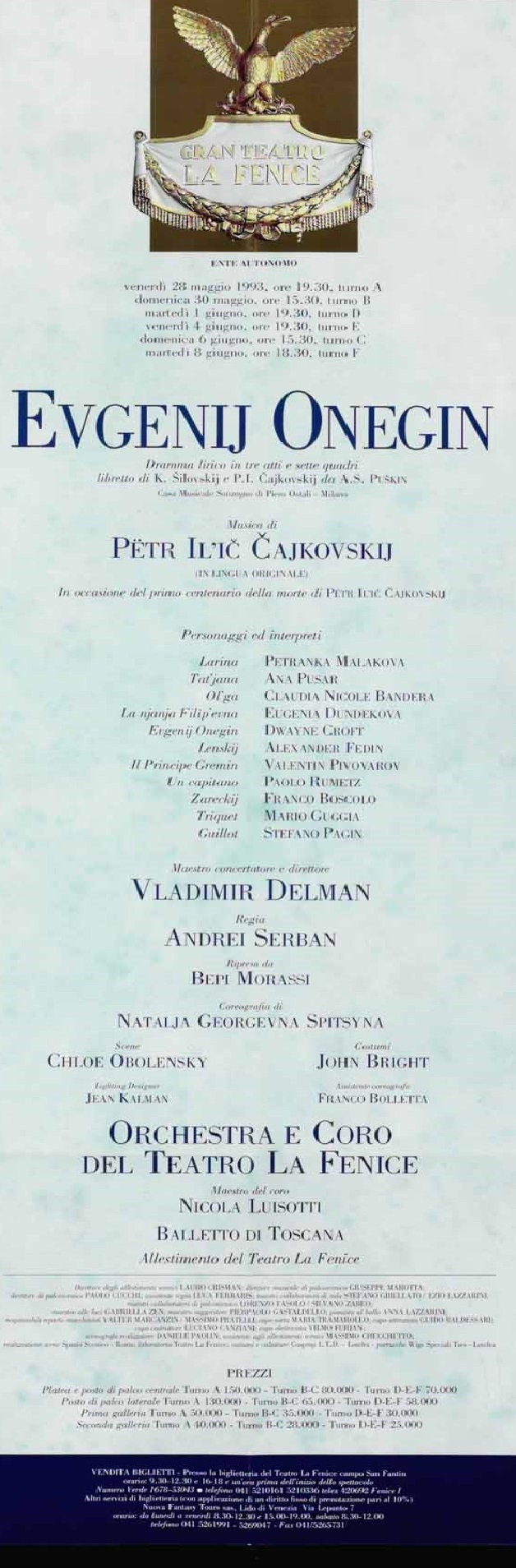 acceptance speech, she discussed the many conductors she had worked with and concluded: “I would like, however, to remember the great help I received from Maestro Vladimir Delman in increasing my understanding of the Russian repertoire. Delman enabled me to enter fully into the character of Tatiana in Eugene Onegin, conveying to me the cultural background and what it means to feel Slav”. Other conductors she mentioned were Karajan, Giulini, Kleiber, Maazel, Ozawa, Levine, Gavazzeni, Abbado and Muti, so implicitly she ranked Delman on the same level. Her tribute was all the more remarkable considering that her husband was Nicolai Ghiaurov, so it is not as if coaching in the language and in “feeling Slav” was not available at home. Freni’s “official” recording of the role of Tatiana was made a few years earlier, in 1987, under Levine. MusicWeb International's Colin Clarke was
