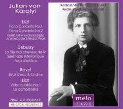 There are hardly any demerits at all about this release. The gap between tracks is a matter of a second or two so I suggest you get ready with the pause button. The performances themselves are often extremely exciting in the core repertoire, and Károlyi emerges as a frequently magnetic romantic stylist. The solo recital shows his aloofly Hungarian-German approach to French music, but one can take that kind of thing once in a while. An excellent acquisition for piano collectors.