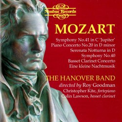 This two CD set compiles the contents of two previous Mozart releases made by Roy Goodman and the Hanover Band for Nimbus in 1990: NI 5228 and NI 5259. The programme is quite diverse, if a bit random, ranging from