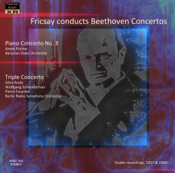 Encouraging musicians to listen to each other and play as though in a chamber group; Fricsay facilitates an internal balance between orchestra and trio in Beethoven’s Triple Concerto. With swells of chivalric pomp undercut by accompanying triplets, the first movement - one of bombastic bursts, vigour and the ebullient efflorescence of youth - begins. The second movement opens with a warm and soothing orchestral serenade which gives way to a sonorous, soprano-voiced cello solo. Pierre Fournier plays this with acute attentiveness to Beethoven’s finely crafted textures. In the Rondo alla Polacca Polish folkloric sounds are punctuated with Fricsay’s crisp clarity. This zesty movement is rhythmically exciting and not at all clumsy or monotonous. The trio and the orchestra intertwine but never convolute or obscure.