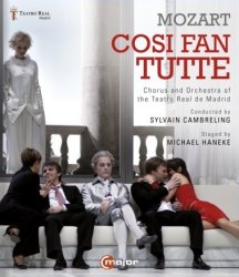 Despite the work’s increasing popularity in the second half of the twentieth century, particularly at Salzburg (review), and recognition of it as being an equal in mastery to the other two Da Ponte operas, it is difficult to bring off. This is particularly so with the emergence, in the last twenty or so years, of avant-garde producers and regietheater productions. Michael Haneke, the Stage Director for this Madrid production, shared with the theatre La Monnaie in Brussels, certainly comes under the former description. He has only ever produced one other opera, Don Giovanni, in a notorious production ay the Paris Opéra in 2006. Here, he takes a not dissimilar sideways look at Mozart’s semi-comedy. It is sometimes called a School for Lovers, as the cynical Don Alfonso tells his two younger male friends that all women are the same, not to be trusted too far in respect of fidelity and then sets out, via, a wager, to prove his theory.
