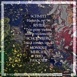 Jean Rivier’s String Trio is more obscure still than Schmitt’s Hasards, but it could scarcely have received a more distinguished recording than this. Composed in 1936 it is refined, elegant and with a sustained and quietly melancholic cast to the slow central movement. The playing is remarkably fine throughout; keenly aware of the piercing lyricism that animates the music, equally sure as to the jolting start of the finale and the freewheeling ebullience of much of the writing. The audience applause has been retained and whilst opinion is split on whether this is ever a good idea I’m with the audience. The Schoenberg Trio was performed on the same occasion as the Rivier, and it’s noticeable how the Pasquier Trio marries moments of austerity with paragraphs of compelling tonal breadth and warmth. It’s certainly one of the most communicative and richly toned performances I’ve come across of the work. The end, though, is somewhat abrupt. Has something happened to the tape here?