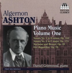 The British Piano Sonata 1870-1945 (Boydell Press, 2001). In the indices of this book were listed some eight sonatas by this composer: at that time there appeared to be no single recording of his music then available. Hardy noted that he had published more than 160 of his works. She concluded her brief review of Ashton’s sonatas by suggesting that he was ‘blandly content with traditional forms and harmony, although the keyboard writing is idiomatic and sonorous.’ Hardy suggests that his piano sonatas do not ‘form a major contribution to the genre and are rather derivative … his position on British music history is that of an outsider.’