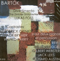 Welcome indeed are these three Bartók recordings of the LP era, lovingly restored by Forgotten Records. They all date from the mid-’fifties. This version of the Divertimento, which for me is the highlight, will be known to many collectors, having had several LP incarnations on Siena Records, Unicorn and Turnabout. The recording under review here has been digitally re-mastered from a good Musical Masterpiece Society (MMS 2175) copy. You wouldn’t think it originated from 1955, such is the full-bodied and crisply defined sound. The Sonata for Two Pianos and Percussion and the Contrasts don’t exhibit the same diaphanous translucency. They were obviously recorded in a less resonant and boxy acoustic and sound more a product of their age, Bam (LD 033) and Westminster/Argo (XWN 18425) being the source copies.