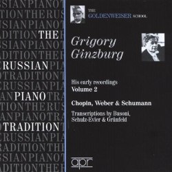 Volume two concentres on Chopin and Schumann, with a valuable series of transcriptions, too. The first piece is the magisterial c.1953 recording of the Bach-Busoni Toccata and Fugue, a performance of variegation, control and commanding authority. Its peaks and troughs are demarcated with tremendous control. Weber’s Rondo brillante is quite a rare example of Ginzburg’s way with this composer and whilst his Schumann Paganini Etudes are better-known quantities they too reveal the unforced excellence of his perceptive musicianship, which was far more convincing in a wider range of styles than is usually thought. The Chopin sequence - three Impromptus, the Fantasy Impromptu, and two Polonaises - comes from c.1948-50. The skittish nature of the A flat major Impromptu is soon diverted into something more weighty, and whilst the Op.53 Polonaise is treated here as a good vehicle for extrovert dynamism, it is not without a commanding profile. The range he cultivates throughout his performances, from the merest whisper to the most Klaviertiger roar is remarkable, and he never bathes his playing in a lush wash of pedal - he is the music’s clarifying servant at all times. And so he proves in the Viennese sweetmeats that end the programme, hyphenated Strauss the Younger, first the notorious Schulz-Evler Concert Arabesques on ‘The Blue Danube’ and then pianist Alfred Grünfeld’s Frühlingsstimmen transcription. Both these may appear too frothy for a supposedly serious-minded virtuoso such as Ginzburg, but of course, not a bit of it. He himself was a transcriber and he used the precedent of Schulz-Evler, in particular, so these two recordings attest to his command of the idiom, and not just his brilliant zest and colouristic élan.