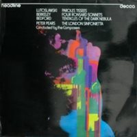 The Tentacles of the Dark Nebula was originally released on Decca Headline HEAD3 with Peter Pears as soloist and David Bedford conducting the London Sinfonietta. The duration is just over seventeen minutes. It was recorded during September 1972 at the Maltings, Snape. The LP also included Witold Lutoslawski’s