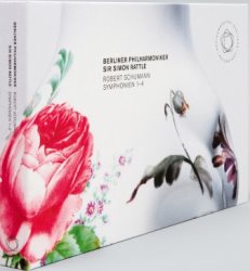 Surprisingly neglected in relation to their quality the symphonies of Robert Schumann run through the Berliner Philharmoniker’s veins like lifeblood and form part of its core repertoire. In fact the orchestra’s first subscription concert in 1882 concluded with a performance of Schumann’s Symphony No. 2 under Franz Wüllner thus beginning a 132 year association with Schumann’s symphonies. An ardent admirer of Schumann’s music, Rattle describes him as the ‘echt’ Romantic. In the interview in the accompanying Blu-ray disc it is clear to see Rattle’s delight at conducting these symphonies saying “It’s like Christmas all year round with these pieces.” For these Rattle uses the standard orchestration of pairs of flutes, oboes, clarinets, bassoons, 4/2 French horns, 2 trumpets, 3 trombones and timpani with forty or so strings.