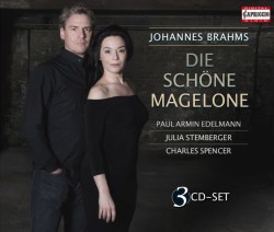 For most collectors this will be all that matters - that we have a new and competitive Die schöne Magelone. Here we also have a reading of the complete Tieck story, given in German by a famous Austrian actress Julia Stemberger. She adopts a suitable “once upon a time” manner, and was recorded in a different studio on a different occasion, and afforded a closer and more intimate acoustic than on the Brahms cycle disc. This means a slight jolt when moving between cosy fireside yarn and lieder recital hall each time one of the poems set by Brahms arrives in the story. However this is more refreshing than restricting, since the whole tale plus songs lasts nearly two hours. I suppose this would appeal only to those fluent in German, though I managed fairly well with my few German words and phrases, while following an English text. Capriccio could have widened the appeal though by including a full English synopsis in the booklet, or a link to a full text and translation on their website. The booklet has just an English note on the cycle and the performers. The song texts are given in German only. Since even German speakers will listen to the Tieck story very occasionally, perhaps Capriccio will make the song-cycle disc available on its own, with a translation of the songs and a linking narrative. That would be an internationally successful issue.