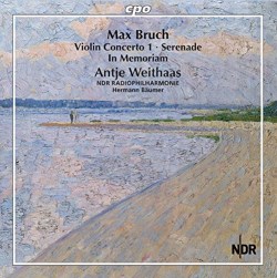 Bruch laboured hard on his Violin Concerto No. 1 in G minor and completed it in 1866. After its première in Koblenz by soloist Otto von Königslöw, Bruch revised the score and later eminent violinist Joseph Joachim was soloist at the first performance of the revision in 1868 in Bremen. Selling the work to a publisher for a relatively small one-off fee must have been a source of great regret to Bruch given its subsequent abiding esteem. Throughout Bruch's the concerto the radiant playing of Antje Weithaas settles on an ideal mix of vibrancy and tenderness. Never in fear of becoming sentimental in the central Adagio I was struck by Weithaas's lovely phrasing which generates emotional intensity. There is plenty of artistry and commitment and this is especially noticeable in the brilliant virtuoso passages of the Finale. Hermann Bäumer ensures that the NDR Radiophilharmonie Hannover plays with spirit, plenty of weight and with a strong dramatic element. There are a plethora of accounts of the Violin Concerto No.1 and although Accardo on Philips and Antje Weithaas on this new CPO release play quite splendidly I will return most often to the recording by soloist Jaime Laredo who directs the Scottish Chamber Orchestra on IMP Classics (PCD 829). Laredo's special account is warm and extremely characterful, direct in approach and so full of joy. Originally released in 1961 on RCA Victor my Laredo recording is a IMP Classics reissue which subsequently been reissued on Regis (RRC 1152).
