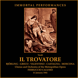 The little known Argentine conductor Ferruccio Calusio is a pleasant surprise and leads a performance of great character, dramatically taut and still lenient towards the singers. He conducted only eight performances at the Met during a three-month period: four Trovatore and four of the double bill Cavalleria rusticana and I Pagliacci but he was much in demand in Italy and had been Toscanini’s assistant at La Scala when they prepared Trovatore in 1925. The choral contributions are also worthy of the performance at large and the sound is homogenous in a way not always met in Met broadcasts of this period. The Anvil chorus in act II has punch though the anvils could have been mightier – here they sound like toy instruments.