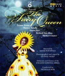 The Fairy Queen was first produced in 1693 at the Dorset Garden Theatre in London. It comprised an adaptation of Shakespeare’s A Midsummer Night’s Dream, possibly by Thomas Betterton, to which a series of five Masques not directly related to the action of the play was added. It is Purcell’s music for these Masques together with a few instrumental numbers that is what is usually thought of as Purcell’s Fairy Queen. Although productions at Glyndebourne and elsewhere have shown that the original mixture of play and music can be effective and entertaining, the version by David Pountney filmed here contains just the musical parts of the whole, but with copious visual references to Shakespeare’s play. These include the characters of Titania and Oberon quarrelling over an Indian boy (here represented by a dancer), Puck (another dancer) and Theseus, King of Athens, as well as a quartet of four (unnamed) lovers and an ass for Titania (but not the untranslated Bottom). No dialogue is included, an understandable and wise decision given the size of the London Colosseum where it was filmed. The music is divided into a series of shorter episodes largely corresponding with Purcell’s score and largely in the order of Anthony Lewis’ edition of 1966 for Novello. In fact it actually uses a new edition by Clifford Bartlett for King’s Music and some sections have additional repeats within them.