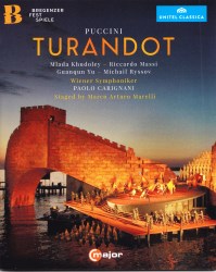 I’m not sure how satisfactorily the huge Bregenz audience on their hard plastic seating experienced the view of the stage and the sound emitted from a large number of speakers. This newly released Blu-Ray of Turandot provides the best seat in the house. Incidentally a scene from the James Bond film Quantum of Solace (2008) was filmed at the Bregenz Festival during a performance of Tosca and contains an interesting view of the floating stage and an appreciation of the grand scale of the on-shore auditorium.