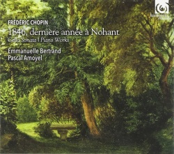 Pianist Pascal Amoyel and cellist Emmanuelle Bertrand have come up with a novel idea for a recital: they focus on the summer of 1846, the last year that Chopin spent happily with his lover George Sand. Holed up in Nohant, a country home so remote it is not even in a wine region, Chopin wrote, started, or completed the diverse works on this disc. They represent a fascinating X-ray of his output.