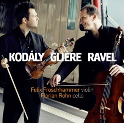 This collection of works for violin and cello issued in 2013 has just come to my attention and it seems appropriate for MusicWeb International to comment. Froschhammer and Rohn have traversed Europe metaphorically speaking with works from Hungarian Zoltán Kodály, Reinhold Gličre from the Ukraine and Frenchman Maurice Ravel.