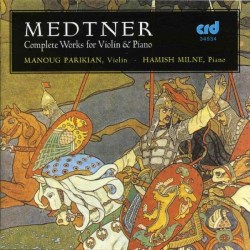 CRD's approach is to mix solo piano works on each disc and in this Chandos and Geoffrey Tozer tracked the same course. I have sampled the CRD piano solo discs. The first of the Three Hymns in Praise of Toil is Before Work op. 49 no. 1. Its placidly cooling ascent to a momentary outburst is followed by an effortless falling back into repose. Milne is a fine advocate even if the composer's even more peaceful version puts it slightly in the shade. Medtner in old age delivers a magically poised reading on APR 5546. The music is disconcertingly suggestive of an April morning somewhere near Chanctonbury rather than the Russian forest. Milne's Sonata-Triad is restful and richly suggestive - basking in a sombre damask glow. Chiming in nostalgic serenity the first of the op. 17 Three Novelles is entitled Daphnis and Chloe. Milne is excellent and this time the composer's dysjunct and halting version on APR comes across as almost stumbling in what requires a virtuosic poet of a pianist. Earl Wild's Ivory Classics version of the Second Improvisation op. 47 is somnolent by comparison; Milne reveals the piece as a fantastic cavalcade. In the Four Skazki op. 34 Milne instantly announces his way. The Magic Violin, with its Kreisler tribute, is measured yet mercurially responsive to Medtner's flickering changes. Recorded by Hyperion as part of their wonderful set of the complete Skazki, the sound is here more cushioned and smooth but the performance is very similar with attention again paid to the work's quasi-salon jauntiness. The timing is about the same. The Meditazione op. 39 No. 1 is more Pierrot-impressionistic than we may be accustomed to from Medtner. Certainly there's nothing of Brahms in this. Irina Ossipova on Arte Nova 74321 93121 2 includes both sets of Forgotten Melodies opp. 38-39. In the Meditazione her approach is more halting, less volatile and not as responsive to the fleeting will-o'-th'-wisp aspects of the writing. Otherwise Milne on the CRD discs is a most attentive and concentrated Medtnerian. Medtner's classic sumptuous filigree and swirl is fully engaged in the Moment Musical - Gnomenklage. It is the third of the Four Pieces op. 3. The lavish romance of the fourth number from Op. 3 is gorgeously reflected in the Prelude in E flat which reaches towards the triumphant lyrical climaxes of the second and third piano concertos. Neither of these op. 3 pieces lasts more than 2:45. The compact Sonata-Skazka is in three movements. As Milne's note points out, it seems strange that this concise and direct-speaking work should share the same opus number as the subtle and large-scale Nightwind sonata. It dates from 1910-11 and its central movement has the sort of simple lyricism that Rachmaninov drew on in the more peaceful variations in the Paganini Rhapsody. The finale draws on stertorous cortège gestures, swirling bell-like asides and romantic abstractions typical of this noble and sincere composer.