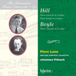 The concerto has appeared on record before. I have an LP copy of Volume 9 of the Australian Festival of Music from 1972 where it is performed by David Bollard with the West Australian Symphony Orchestra conducted by no less a celebrity than Georg Tintner. That performance may still be heard on YouTube. In many respects the Hyperion CD sounds like a slightly updated recording of the same performance, although overall Bollard is more sprightly. Piers Lane, as an Australian, is an appropriate choice for this music. He does his considerable best with it, emphasising the reflective aspects of the music and seemingly attempting to make what some may regard as weaknesses into strengths. I find it difficult to imagine the piece played better or with greater subtlety. Lane achieves much the same with the earlier sonata but, stripped of its orchestral colour, the piece is less interesting. Whilst one can appreciate the merits of the idea of illustrating the genesis of the concerto, having two such similar pieces almost side by side also emphasises how little they differ. This juxtaposition, then, could be regarded as the bland leading the bland. Fortunately, we also get the Boyle concerto, which is a considerably more red-blooded affair.